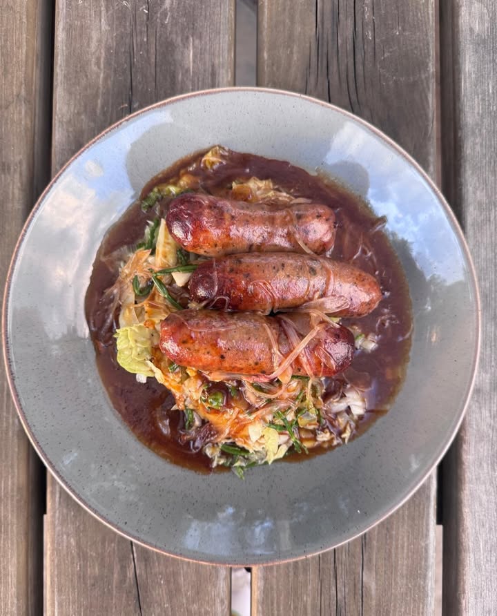 Pork sausages, mash, onion gravy, buttered spring green